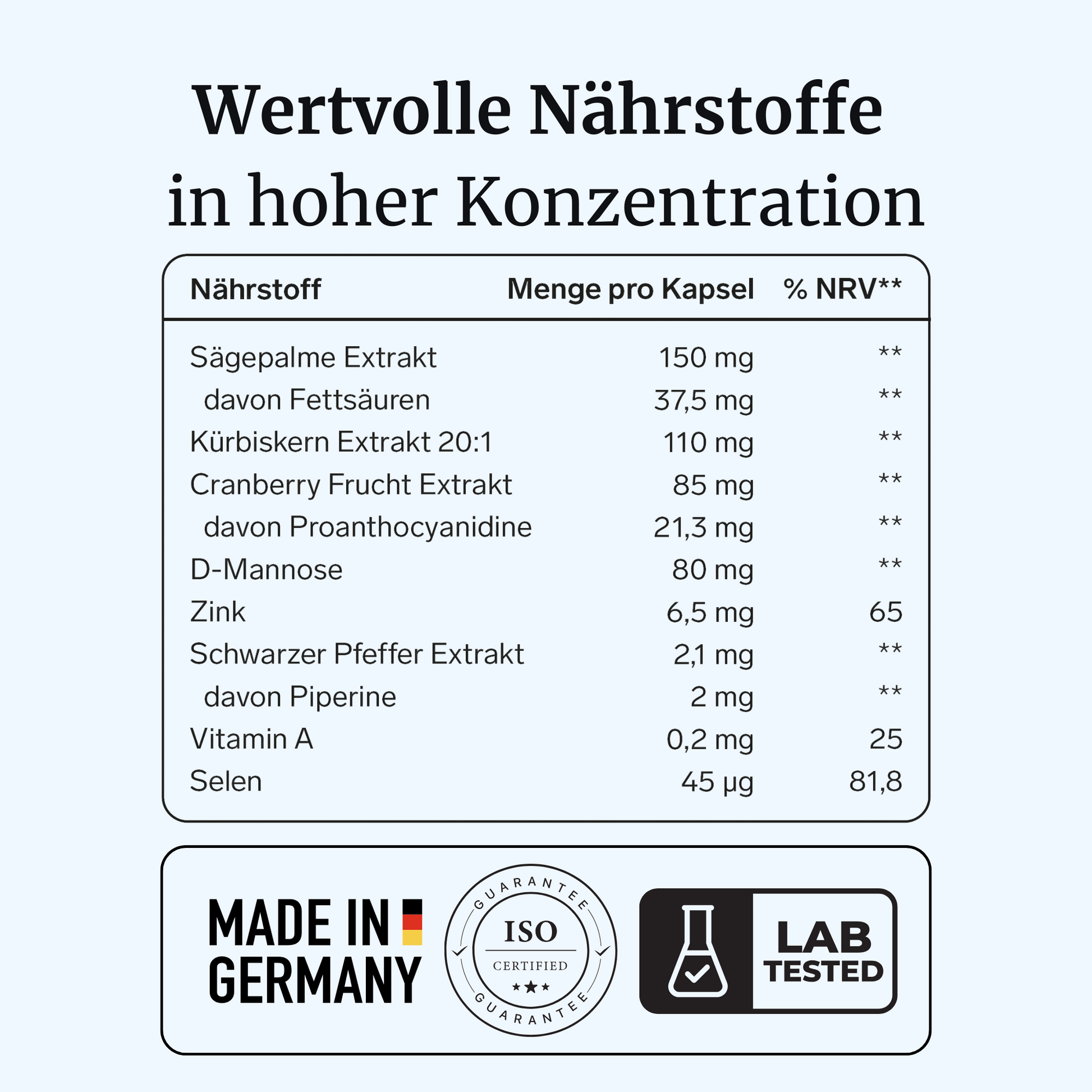 Bewährte Pflanzenextrakte wie Sägepalme, Kürbiskern, Cranberry und D-Mannose kombiniert mit Vitamin A, Zink und Selen – für eine ganzheitliche Unterstützung der Blasen- und Harnwegsfunktion.